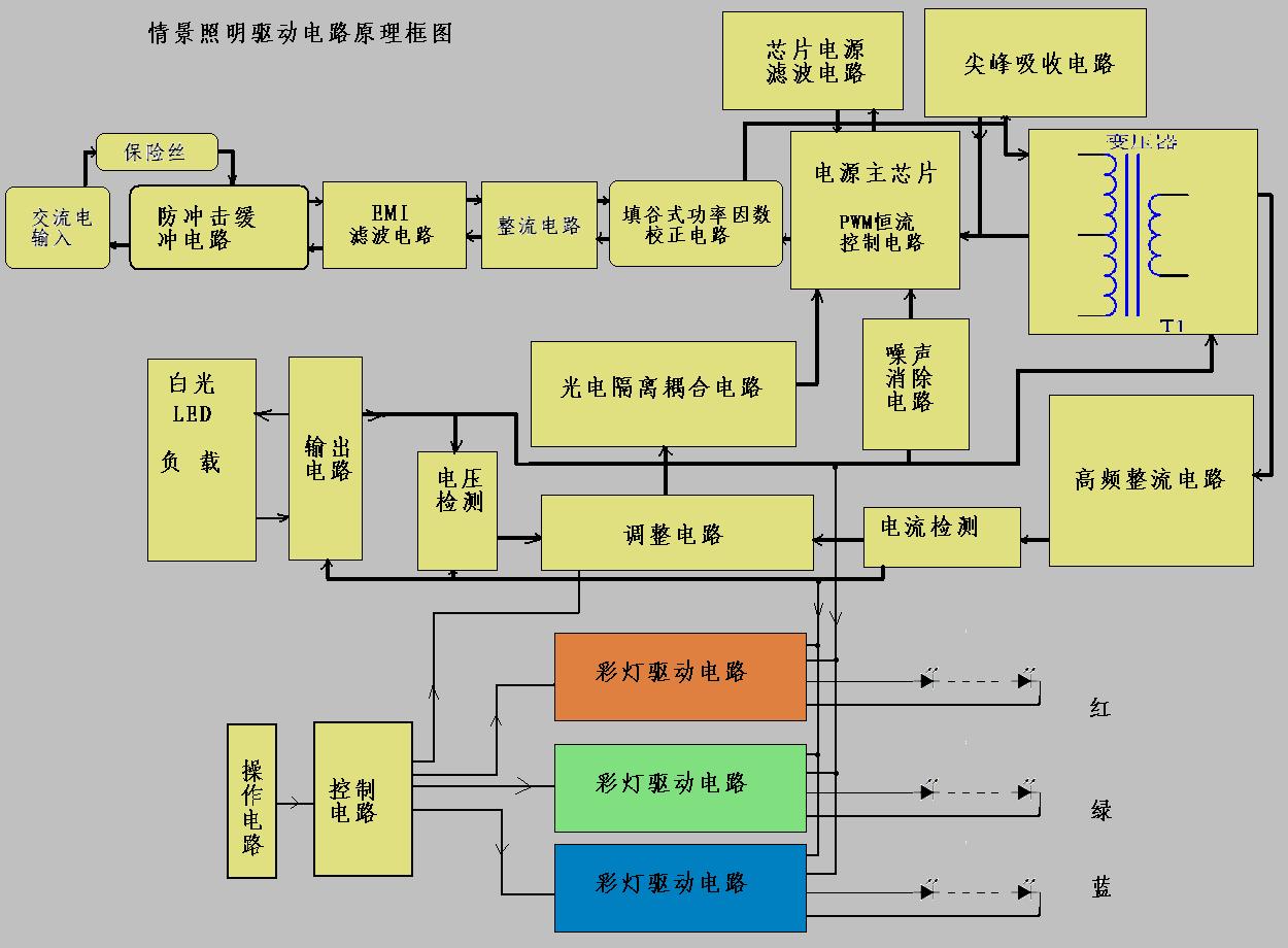 情景照明LED驅動(dòng)線(xiàn)路的原理框圖:
