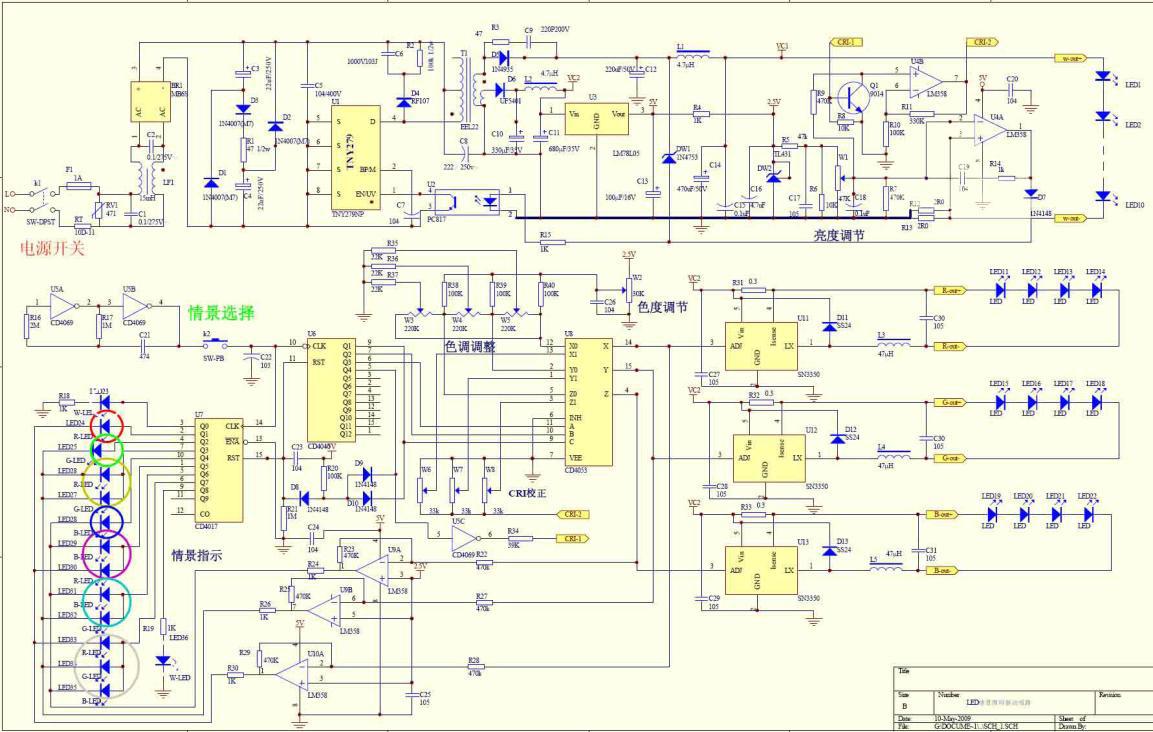 情景照明的LED驅動(dòng)線(xiàn)路設計以白光LED驅動(dòng)為主,以彩色LED驅動(dòng)為輔,驅動(dòng)輸出白光LED功率為10W,10W白光LED輸出光通量相當60W的白熾燈,照明效果可達到100W白熾燈(LED不含紅外線(xiàn)以及有較高光源利用率),可滿(mǎn)足室內照明對照度的一般要求;驅動(dòng)輸出三基色LED功率為3×4W,能滿(mǎn)足對彩色景照明的一般要求。三基色可以組合千變萬(wàn)化,種類(lèi)繁多的絢麗色彩,為使操作的方便性,本情景照明的LED驅動(dòng)線(xiàn)路設置兩個(gè)主電位器和一個(gè)情景模式選擇輕觸按鍵開(kāi)關(guān),以及三個(gè)輔助電位器,兩個(gè)主電位器分別用于主白光LED亮度調節和單色、混合彩色LED亮度的調節,情景模式選擇輕觸按鍵開(kāi)關(guān)用于切換下面介紹的情景模式,三個(gè)輔助電位器用于微調混合色色調或者個(gè)人偏好的色調。