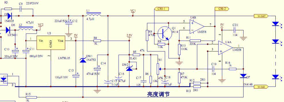 一路輸出為VC1,用于白光LED驅動(dòng),電阻R12、R13為白光LED電流檢測電阻,電位器W1是亮度調節電位器,可調節預置一定的電壓,運放U4a用于比較電位器W1電壓和電阻R12、R13的電壓,其輸出通過(guò)光耦反饋來(lái)調節輸出電流的大小,亦即調節白光LED的亮度。DW1用于電路輸出電壓控制,防止LED負載或電位器為W1開(kāi)路而使驅動(dòng)電路輸出高電壓,Q1和U4B是用于跟蹤電位器W1電壓變化而相應輸出電壓變化的可控的電路,其輸出電壓用于控制彩色LED的功率輸出,目的是提高LED燈具出光顯色性指數,補償單白光LED顯色性指數偏低的缺陷;