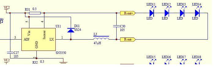 彩燈驅動(dòng)電路采用SN3350,應用其推薦典型電路,增加C30,減小輸出電流紋波,提高發(fā)光穩定度。亮度控制采用直流電壓調整方式,電路相對簡(jiǎn)單,無(wú)噪聲,出光無(wú)閃爍。
