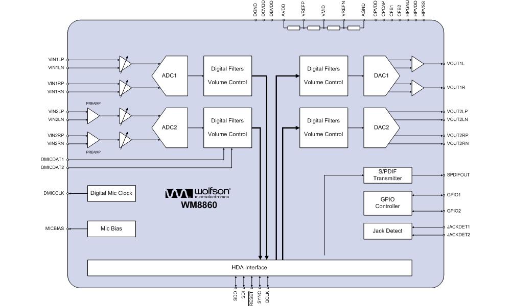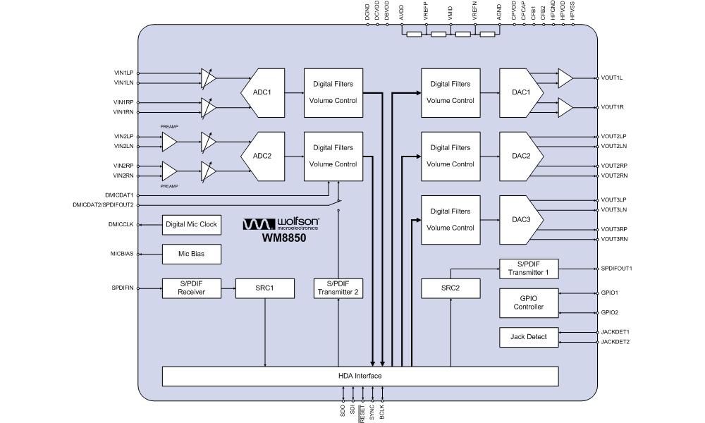這兩款器件都和業(yè)界標準的高清晰度音頻接口完全兼容,并且符合視窗硬件質(zhì)量實(shí)驗室(WHQL)的規范。WM8850帶有三個(gè)高性能的立體聲數字模擬轉換器(DAC),能夠實(shí)現六個(gè)通道的高清晰度音頻,是5.1多通道環(huán)繞聲音頻系統的理想之選;同時(shí),WM8860集成了兩個(gè)高性能的立體聲DAC,能夠實(shí)現四個(gè)通道的高清晰度音頻。隨之附帶的軟件可確保高級應用場(chǎng)景、低功耗運行和基于Windows7的音頻框架,同時(shí)也支持Windows Vista、XP 和 Linux。而核心部分正是歐勝的Audio Studio,它為可用性和特色性能建立了新的基準,此外還嵌入了歐勝的SoundStage聲效引擎。
