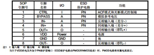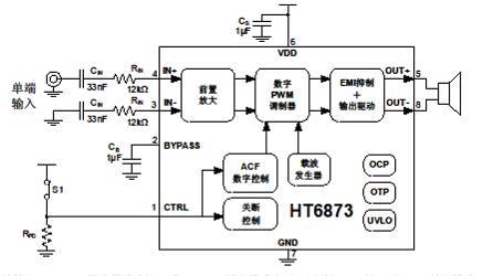 (2)單端輸入,ACF-1 固定模式應用,或 ACF-2 固定模式應用。通過(guò)打開(kāi)開(kāi)關(guān)S1進(jìn)入SD關(guān)斷模式;若不需SD低功耗應用,可去掉開(kāi)關(guān)S1。(請根據預置模式和VDD電壓設置不同RCTRL1和RCTRL2值)