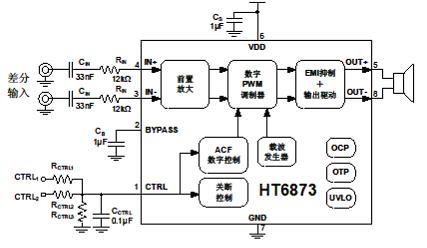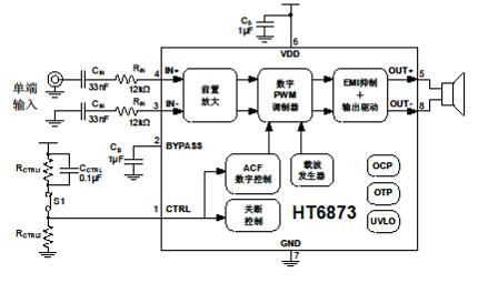 HT6873內部集成免濾波器數字調制技術(shù),能夠直接驅動(dòng)揚聲器,并最大程度減小脈沖輸出信號的失真和噪音。輸出無(wú)需濾波網(wǎng)絡(luò ),極少的外部元器件節省了系統空間和成本,是便攜式應用的理想選擇。