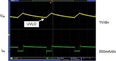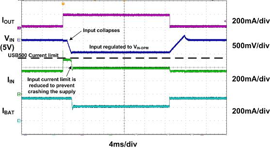 圖 3 電源路徑拓撲結構舉例 最低系統電壓 使用傳統方法時(shí),系統電壓始終與電池相同。因此,電池深度放電時(shí),在電池充電到某個(gè)可用電平以前系統都不會(huì )啟動(dòng)。利用PPM,可對系統電壓?jiǎn)为毞壓,將其與電池電壓區分開(kāi)來(lái)。這就意味著(zhù)可以實(shí)現最低系統電壓,其與電池電壓無(wú)關(guān)。對用戶(hù)而言,這就意味著(zhù)連接適配器的同時(shí)他們便可以使用設備,假設條件是其具有足夠的功率來(lái)驅動(dòng)系統。如bq25060 等器件就具有這種功能。 更短的充電時(shí)間 由于系統電流和充電電流是單獨編程的,因此可以使用適配器的滿(mǎn)功率,其與電池的容量和充電電流的大小均無(wú)關(guān)。傳統拓撲結構中,充電器的輸出電流必須設定為最大充電電流,以應對沒(méi)有系統負載的情況。當系統中有負載時(shí),由于系統吸收可用電流,有效充電電流降低。例如,一個(gè)使用900 mA 適配器和500 mAhr 電池的系統,使用傳統方法可以編程500 mA 的充電電流。如果系統負載為200 mA,有效充電電流僅為300 mA,充電時(shí)間幾乎翻了一翻。如果使用PPM 來(lái)研究這一相同案例,輸入電流限制設定為900 mA。這樣便允許全部500 mA充電電流,且擁有多達400 mA 的額外系統電流。 終止和早期計時(shí)器超時(shí) 在對總電流進(jìn)行穩壓的傳統系統中,電流在電池和負載之間共用。如果系統負載足夠大到從電池拉取充電電流,且在計時(shí)器超時(shí)以前電池不充電,則計時(shí)器會(huì )出現偽超時(shí)。另外,如果系統電流絕對不會(huì )降至設定終止電流以下,則永遠不會(huì )終止。電源路徑管理通過(guò)單獨監測充電電流,并動(dòng)態(tài)地使用可穩壓計時(shí)器(通過(guò)減少充電電流進(jìn)行穩壓),防止這些條件出現。就終止問(wèn)題而言,單獨對充電電流進(jìn)行監測,可讓終止條件測定變得容易。 基于輸入電壓的動(dòng)態(tài)電源管理 (VIN-DPM) 為了防止出現輸入源超負載的欠壓狀態(tài),一些器件實(shí)施了基于輸入電壓的動(dòng)態(tài)電源管理(VIN-DPM)。這種環(huán)路降低輸入電流限制來(lái)防止輸入崩潰。VIN-DPM 環(huán)路對輸入電壓進(jìn)行有效的穩壓,來(lái)最大化電源的電流。圖4 顯示了在無(wú)VIN-DPM 保護的情況下USB 端口的超負載結果。請注意,輸入電壓降至電源狀態(tài)良好閾值以下時(shí),充電器關(guān)閉。這樣便關(guān)閉了電源負載,并允許輸入電壓恢復,從而開(kāi)啟充電器。這種開(kāi)/關(guān)脈沖發(fā)生并不是我們想要的。