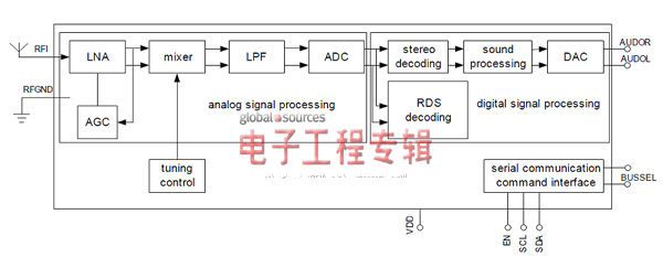 第一階段是模擬信號處理階段,該階段負責將RF天線(xiàn)信號轉換為一個(gè)較低的中頻(IF)數字信號。自動(dòng)增益控制單元(AGC)將低噪聲RF放大器(LNA)保持在其線(xiàn)性工作范圍內;祛l器用于將接收到的RF信號下變頻為較低的中頻(IF)信號。而ADC將信號轉換為數字格式。在數字域內完成FM解調。此外,數字信號處理器也用于處理RDS數據。    調頻收音機配件的實(shí)施    圖2中的完整FM系統采用通用型FM radio芯片,其簡(jiǎn)單實(shí)施方框圖如下所示:       圖2:系統方框圖