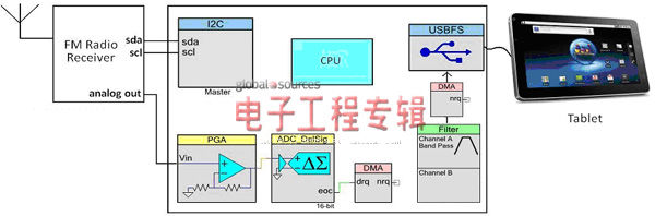 可添加按鈕等控制對象,用來(lái)實(shí)施頻道掃描、下一頻道、上一頻道和音量控制等各種不同操作。除此之外,還可以將數字音頻錄制為.WAV文件。也可以針對Android操作系統和 Apple的iOS開(kāi)發(fā)類(lèi)似應用。    PSoC 3等現代SOC可以通過(guò)單芯片的方式實(shí)現即插即用型調頻收音機配件。模擬音頻放大、數字化、濾波、向主機傳輸音頻流以及控制FM接收器等操作都能得到高效處理。當不工作時(shí),這種由總線(xiàn)供電的設備可以使FM接收器和SOC在待機和斷電等低功耗模式下運行,因此它在平板電腦等電池供電的主機中使用時(shí)具有很高的能效。平板電腦的時(shí)代已然開(kāi)啟,這種微型配件將利用計算設備中的已有資源實(shí)現巨大價(jià)值。 |