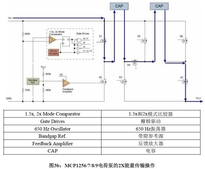 開(kāi)關(guān)電容穩壓器也稱(chēng)為電荷泵。此概念包括倍壓器、分壓器、負壓發(fā)生器和直流-直流穩壓器等。為了將電荷泵用作穩壓器,器件通常先將電壓倍增,然后將穩壓后的電壓送至所需輸出。當輸入電壓與輸出電壓之間的差異較小時(shí),轉換過(guò)程中會(huì )有能量損失。因此,可使用多級電荷泵來(lái)幫助提高效率。圖3a和3b展示了MCP1256系列的雙模式電荷泵操作。