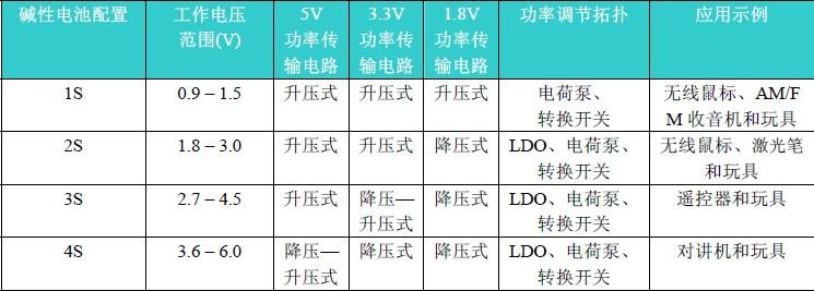 電池技術(shù)可簡(jiǎn)單地分為兩類(lèi):不可充電型和可充電型。不可充電電池在使用一次后即廢棄,稱(chēng)為一次性電池。堿性電池是最常見(jiàn)的家用一次性電池。市面上也有堿性可充電電池,但不在本文的討論范圍內。典型堿性電池具有大約1.5V至1.65V的浮動(dòng)電壓,標稱(chēng)電壓為1.2V,壽命結束時(shí)的電壓為大約0.9V。單節堿性電池壽命結束時(shí)的電壓可低至0.7V-0.8V,具體取決于負載電流。表1展示了一些常見(jiàn)的堿性電池配置。某些應用可采用多種配置,具體取決于產(chǎn)品外形、系統要求、可用解決方案和功耗預算。