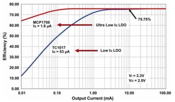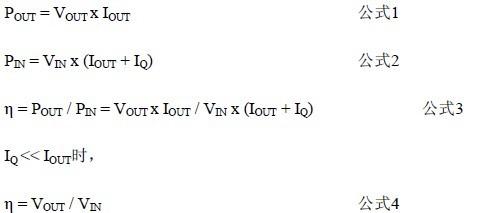 圖1演示了LDO的效率。如果輸出電流遠大于靜態(tài)電流(IQ),則可以忽略IQ。對于線(xiàn)性電路,輸入電流等于輸出電流與靜態(tài)電流之和。因此,效率可簡(jiǎn)化為輸出電壓除以輸入電壓,如公式4所示。在電池供電設計中,IQ非常重要,因為待機時(shí)間將決定更換一次性電池的頻率或對二次電池進(jìn)行充電的頻率。延長(cháng)待機時(shí)間的方法之一是選擇低IQ器件。圖2展示了兩種LDO(MCP1700與TC1017)的效率比較圖。負載電流很。ㄈ100μA)時(shí),MCP1700 LDO的 效率比TC1017高25%。但是,在負載電流超過(guò)