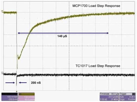 盡管低IQ可延長(cháng)待機時(shí)間,但也存在與此相關(guān)聯(lián)的性能下降問(wèn)題,例如對線(xiàn)路瞬變和負載的響應時(shí)間變長(cháng),以及對電源噪聲的抑制能力變弱。圖2展示了一個(gè)負載響應時(shí)間的示例。圖2的結果表明,如果性能對于設計很重要,不容有任何損失,那么在不提高成本的情況下,很難保持較低的IQ?朔苏系K的另一種方法是選擇具有關(guān)斷或待機功能的器件。例如,MCP1802 LDO工作在10 kHz時(shí)的電源抑制比(Power Supply Rejection Ratio,PSRR)高達70dB,但其只消耗25μA的靜態(tài)電流。處于關(guān)斷模式時(shí),MCP1802 LDO僅提供10nA的典型待機電流。這一便利的功能有助于在系統關(guān)閉時(shí)將功耗降至最低。開(kāi)關(guān)穩壓器和MCU等器件可采用相同的理論來(lái)延長(cháng)待機時(shí)間。