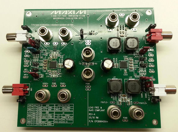 作為一名應用工程師,我有機會(huì )接觸Maxim Integrated的所有器件和評估板。我使用了功率最高的D類(lèi)放大器——MAX98400A。這款器件很有優(yōu)勢,因為既可配置為每通道達20W功率的立體聲放大器,稍加調整后又可配置為40W單聲道放大器。另外,評估板上還有兩個(gè)共用電源軌放大器(圖1)。