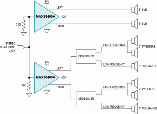 圖2. 在手提音箱中采用兩個(gè)MAX98400A放大器的揚聲器元件原理圖。一個(gè)放大器專(zhuān)用于推動(dòng)大8in揚聲器,另一個(gè)放大器通過(guò)交叉點(diǎn)開(kāi)關(guān)推動(dòng)兩個(gè)2in高音揚聲器和一個(gè)3in全頻揚聲器。
