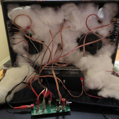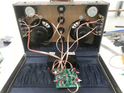 圖3. 我使用規格為12的音頻線(xiàn)(據我所知,這很穩固)和香蕉插孔將揚聲器連接至電路板。然后將交叉點(diǎn)開(kāi)關(guān)用膠水粘在手提音箱壁上。