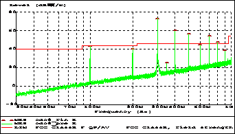 由于兩個(gè)原因,時(shí)鐘信號常歸咎于 EMI。即使時(shí)鐘低頻率運行,較好的時(shí)鐘上升/下降沿也包含大量的奇次諧波,其在更高頻率時(shí)會(huì )引起 EMI。另外,時(shí)鐘通常會(huì )在板上傳播一段較長(cháng)的距離,從而更可能給其他組件帶來(lái)干擾。通常,EMI 可通過(guò)頻譜分析儀測量,如圖 1 所示。圖中,綠色信號存在一些超出紅色 FCC 屏蔽的頻率分量(300MHz、400MHz 和 500MHz 等)。
