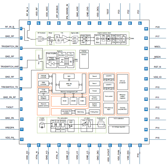 The device includes a series of timers to allow for autonomous polling and wake-up applications. The TX and RX data buffers are located in the RAM with autonomous direct memory access (DMA), reducing the ’real-time’ overhead for the accompanying micro-controller. The device can be interfaced via SPI, UART or LIN protocol compatible UART. Simplified programming of the device is facilitated by the HAL (Hardware Abstraction Layer).