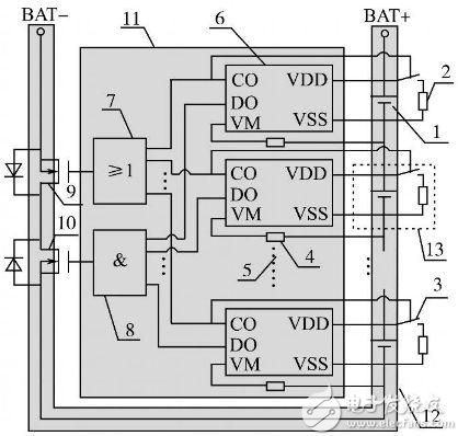 其中:1為單節鋰離子電池;2為充電過(guò)電壓分流放電支路電阻;3為分流放電支路控制用開(kāi)關(guān)器件;4為過(guò)流檢測保護電阻;5為省略的鋰電池保護芯片及電路連接部分;6為單節鋰電池保護芯片(一般包括充電控制引腳CO,放電控制引腳DO,放電過(guò)電流及短路檢測引腳VM,電池正端VDD,電池負端VSS等);7為充電過(guò)電壓保護信號經(jīng)光耦隔離后形成并聯(lián)關(guān)系驅動(dòng)主電路中充電控制用MOS管柵極;8為放電欠電壓、過(guò)流、短路保護信號經(jīng)光耦隔離后形成串聯(lián)關(guān)系驅動(dòng)主電路中放電控制用MOS管柵極;9為充電控制開(kāi)關(guān)器件;10為放電控制開(kāi)關(guān)器件;11為控制電路;12為主電路;13為分流放電支路。單節鋰電池保護芯片數目依據鋰電池組電池數目確定,串聯(lián)使用,分別對所對應單節鋰電池的充放電、過(guò)流、短路狀態(tài)進(jìn)行保護。該系統在充電保護的同時(shí),通過(guò)保護芯片控制分流放電支路開(kāi)關(guān)器件的通斷實(shí)現均衡充電,該方案有別于傳統的在充電器端實(shí)現均衡充電的做法,降低了鋰電池組充電器設計應用的成本。
