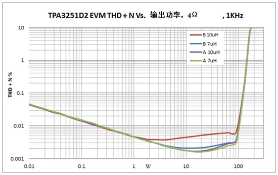 其它因素,如高輸出功率電平條件下開(kāi)關(guān)損耗或歐姆損耗,將確定哪種電感器最適用于一個(gè)給定的系統。然而,通過(guò)選擇一個(gè)線(xiàn)性度更大的一個(gè)電感器,您可顯著(zhù)提高D類(lèi)放大器的THD性能,這可通過(guò)TPA3251D2的超低THD得以證明。