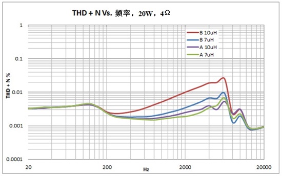 從TPA3251D2EVM收集的數據來(lái)看,生產(chǎn)商A的10μH電感器優(yōu)于制造商B的10μH和7μH電感器。若我選擇制造商B的10μH電感器,放大器的THD性能將在10W條件下限制在0.0045%,相比之下,制造商A的10μH電感器將限制在0.0017%。
