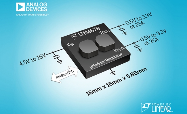 Analog Devices, Inc (ADI) 宣布推出 Power by Linear™ LTM4678,該器件是一款具有 PMBus 數字接口的雙通道 25A 或單通道 50A 降壓型µModule ® 穩壓器。 LTM4678 將兩個(gè)電感器疊置并裸露在 BGA 封裝的頂部以充當散熱器,可幫助散發(fā)封裝內部的熱量,從而使器件保持低溫 。用戶(hù)可利用片內 EEPROM 和 PMBus I2C 測量、改變和記錄主要的電源參數,例如電壓、負載電流、溫度和時(shí)序。5 個(gè) LTM4678 能夠通過(guò)均流 (各分擔 50A) 為處理器、FPGA 和 ASIC 等負載提供高達 250A 的電流。主要應用包括 PCIe 板、通信基礎設施、云計算、光學(xué)以及醫療、工業(yè)和測試與測量設備。