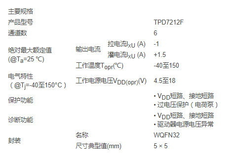 TPD7212F采用符合RoHS標準的WQFN32封裝,尺寸僅為5.0mm x 5.0mm,與其上一代產(chǎn)品相比,其安裝面積降低多達75%。該產(chǎn)品完全符合AEC-Q100汽車(chē)標準,工作溫度為-40°C至+150°C。