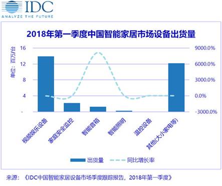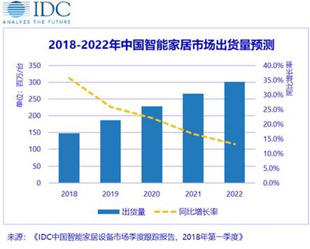 《IDC中國智能家居設備市場(chǎng)季度跟蹤報告》顯示,2018年第一季度中國智能家居市場(chǎng)出貨量2989萬(wàn)臺,同比增長(cháng)26.3%。其中視頻娛樂(lè )設備和其他(大小家電等)占整體出貨量的87.4%;此外,智能音箱、智能照明以及溫控設備同比增長(cháng)速度最快。預計2018年智能家居市場(chǎng)將達到1.5億臺,同比增長(cháng)35.7%。預計到2022年該市場(chǎng)出貨量將突破3億臺,其中主要增長(cháng)來(lái)源于家庭安全監控、智能照明和智能音箱。