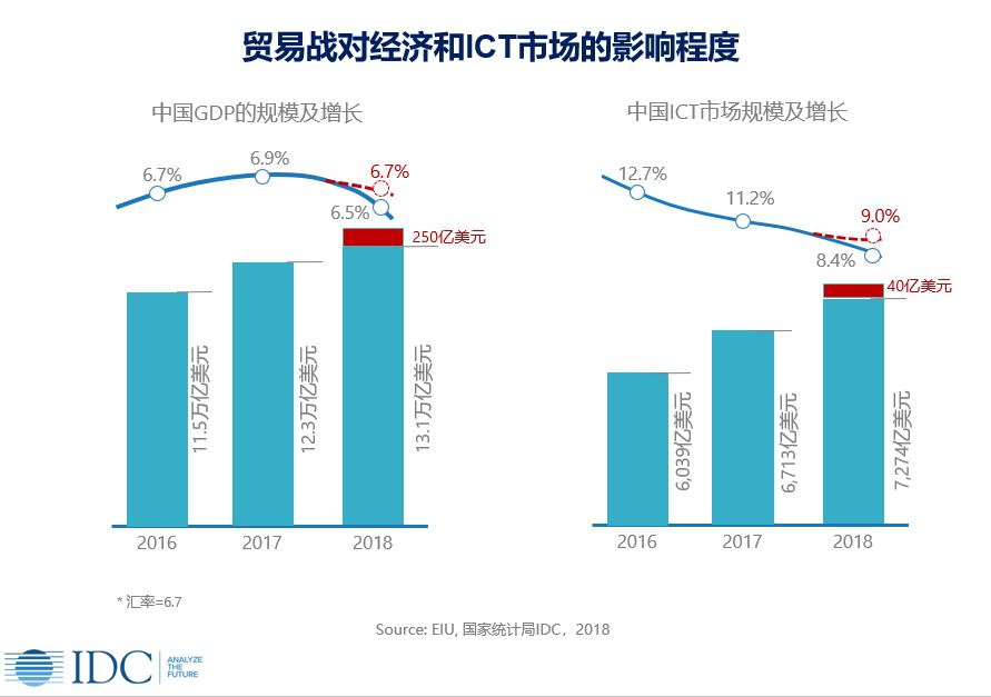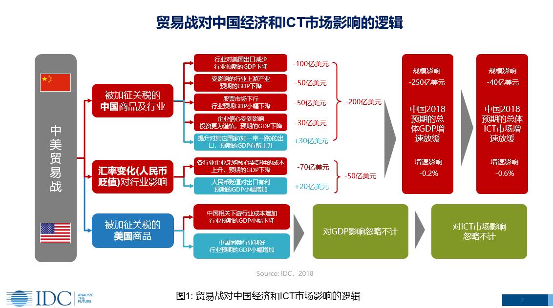 貿易戰對中美兩國的經(jīng)濟都將有負面影響,特別是對貿易順差巨大的中國。根據IDC的研究,基于當前雙方各340億美元產(chǎn)品開(kāi)始加征關(guān)稅,中國2018年GDP增長(cháng)率將減少0.2%(原來(lái)的6.7% 到影響后的6.5%),影響的GDP總額約250億美元(1US$=6.7 RMB)。中國2018年總體ICT市場(chǎng)增長(cháng)率將減少0.6%(原來(lái)9.0%到影響后的8.4%),影響的ICT市場(chǎng)規模約40億美元。