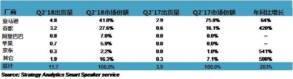 2018年Q2全球智能音箱市場(chǎng)按廠(chǎng)商劃分(出貨量:百萬(wàn)臺)