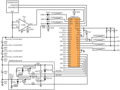 圖 1:6 節電池監視系統的簡(jiǎn)化原理圖。LTC6803 測量電池電壓并