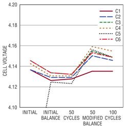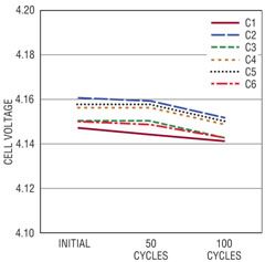 電池組 1 經(jīng)過(guò)了 100 個(gè)充電 / 放電周期,圖 3 顯示若干周期后記錄 6 節電池的電壓。該圖顯示,經(jīng)過(guò)短暫停頓后,在一個(gè)完整的充電周期結束時(shí)所測得的電池電壓。充電后,電池電壓之間的不平衡與容量和內部電阻的小量變化有關(guān)。在第一個(gè)完整的周期中,測得的電池組容量為 2.072AHr,經(jīng)過(guò) 100 個(gè)周期后,所測得的容量為 2.043AHr,隨著(zhù)周期數增加,容量有少量下降。還有一種趨勢,即隨著(zhù)充電 / 放電周期數的增加,充電后電池的最終電壓下降了,100 個(gè)周期以后,這種趨勢尤其顯著(zhù)。這種趨勢最有可能是因為電池老化引起電池內部電阻的小量增加導致的。內部電阻增加使電池更快地達到充電結束門(mén)限。盡管在工作時(shí)沒(méi)有平衡,這個(gè)電池組在 100 個(gè)周期中自始至終保持著(zhù)同樣程度的不平衡。能像這個(gè)電池組一樣,每節電池自然而然相互匹配的電池組相當罕見(jiàn)。
