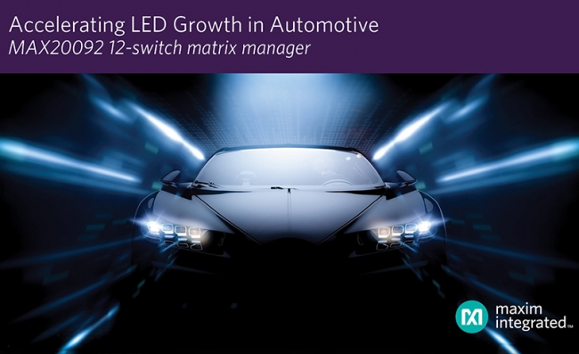 Maxim Integrated Products, Inc (NASDAQ: MXIM)宣布推出MAX20092 12通道開(kāi)關(guān)矩陣管理器,使得高性能LED陣列車(chē)燈和自適應光束調節設計能夠滿(mǎn)足更高電流的設備需求,同時(shí)降低方案尺寸、提高靈活性。通過(guò)最低導通電阻(RDS_ON)的內部開(kāi)關(guān),該IC可最大程度減少LED陣列照明的發(fā)熱,相比最接近的競爭方案降低65%。