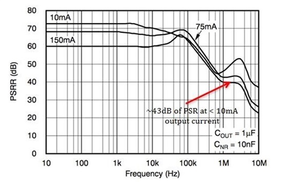 通常情況下,我們在SMPS的輸出上添加一個(gè)LDO來(lái)解決這個(gè)問(wèn)題。LDO減少了電源設計的總體效率;然而,它使我們能夠將效率保持在70%,與全線(xiàn)性解決方案相比,總體性能得以提升,它們的總體效率在10-20%之間。LDO還特有電源抑制 (PSR) 功能。PSR對功率波動(dòng)有所幫助,由于LDO充當濾波器的角色,波動(dòng)就不會(huì )再對傳感器產(chǎn)生影響了。我們來(lái)看看使用TPS717 LDO時(shí)的情況。