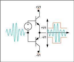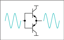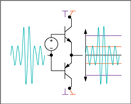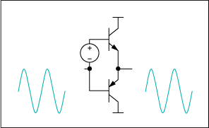 圖3. AB類(lèi)放大器將兩個(gè)晶體管偏置,使其在信號接近零時(shí)能夠導通。所以這類(lèi)放大器的效率比A類(lèi)放大器高,失真比B類(lèi)放大器小。