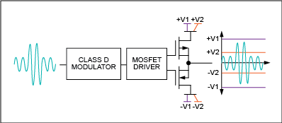 圖6. DG類(lèi)放大器檢測輸出信號的幅值,然后根據需要切換電源軌,以更高的效率提供需要的功率。