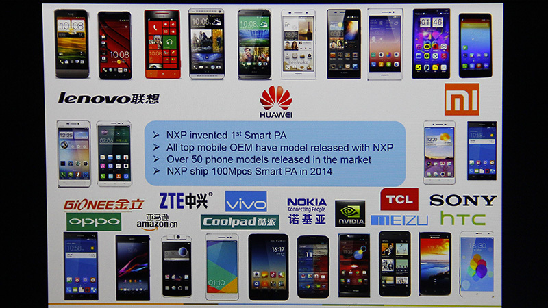 據Steve透露目前幾乎所有中國一線(xiàn)手機廠(chǎng)商大量旗艦機都采用了恩智浦的智能功放產(chǎn)品,2014年恩智浦功放出貨一億以上,包括小米、HTC、VIVO、聯(lián)想、華為、魅族、中興、金立、酷派等都在使用,有50款機型采用了這個(gè)智能功放。
