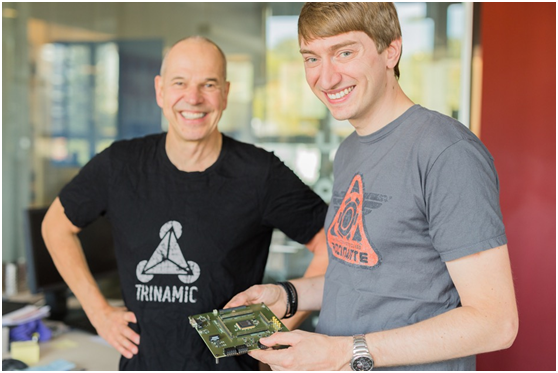 圖1 TRINAMIC首席執行官MichaelRandt和Onno Martens博士展示全球首款RISC-V電機驅動(dòng)器芯片。