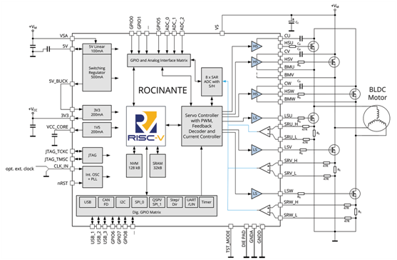 該組件也是世界上第一個(gè)在單一RISC-V中實(shí)現高壓技術(shù)的產(chǎn)品,可以實(shí)現能夠直接驅動(dòng)N溝道的MOSFETs進(jìn)而控制BLDC, 步進(jìn)電機, 直流有刷電機以及音圈電機。