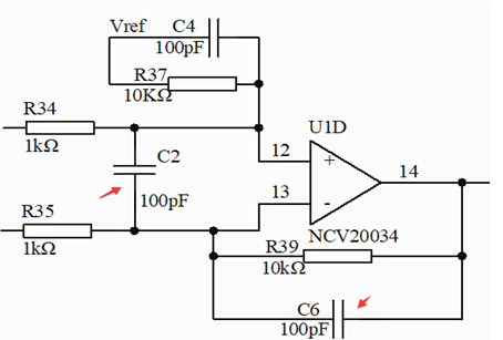 運放芯片本身對共模干擾有抵抗作用,而在差模干擾的抵抗作用稍弱,所以設計的時(shí)候要著(zhù)重提高差分線(xiàn)上的差?垢蓴_能力。如圖2所示,C2電容就是為了提高抗差模干擾能力。差分線(xiàn)上的電阻(R34、R35)和反饋電阻(R39)應使用高精度的電阻,使得理論計算得到的參數是準確可靠的。然后與運放的輸出連接的AD口引腳上并連一個(gè)RC電路濾掉高次諧波干擾和隨機脈沖干擾,從而提升抗干擾能力。