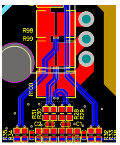 為了能夠準確的采樣電流,應將運放芯片在PCB上的位置盡量靠近采樣電阻,同時(shí)又要使運放芯片不能遠離MCU,運放的地和MCU的地應該盡量靠攏。如圖3所示,采樣電阻(R98、R99、R100)兩端走差分線(xiàn)到運放的同相和反相端口,差分線(xiàn)應等距并且盡量短,以避免其他的干擾產(chǎn)生。壓縮機涉及到高壓和低壓部分,在布局電流地的時(shí)候,應使大電流地和小電流地能很好的單點(diǎn)隔離。