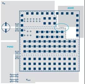 圖2.分開(kāi)的AGND和PGND在接地標簽下方利用過(guò)孔連接。