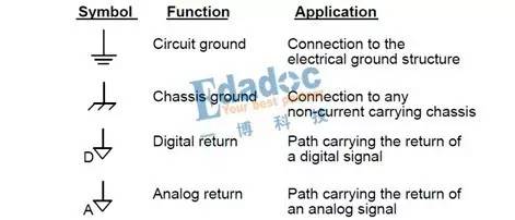 回到EMC培訓,Mark的觀(guān)點(diǎn)其實(shí)很清楚了,那就是地在PCB里是不存在的,它只是0v參考的符號象征。除非我們的設計或應用在操作上需要區分數字和模擬電路,且需要將兩者彼此分割,或者需要從0v參考地區分不同的功能區域如機殼和ESD地,而且就算在同一系統里使用不同的地,在系統的某個(gè)地方也需要將這幾種不同的地連接起來(lái),并且需要EMC工程師來(lái)保障相關(guān)的連接是否可行。除此之外其他的設計都建議大家使用一個(gè)地的符號來(lái)表示0v參考。下圖是幾個(gè)常見(jiàn)地的表示符號及功能應用解釋?zhuān)⒁鈹底趾湍M地用的是回流來(lái)形容而不是地。