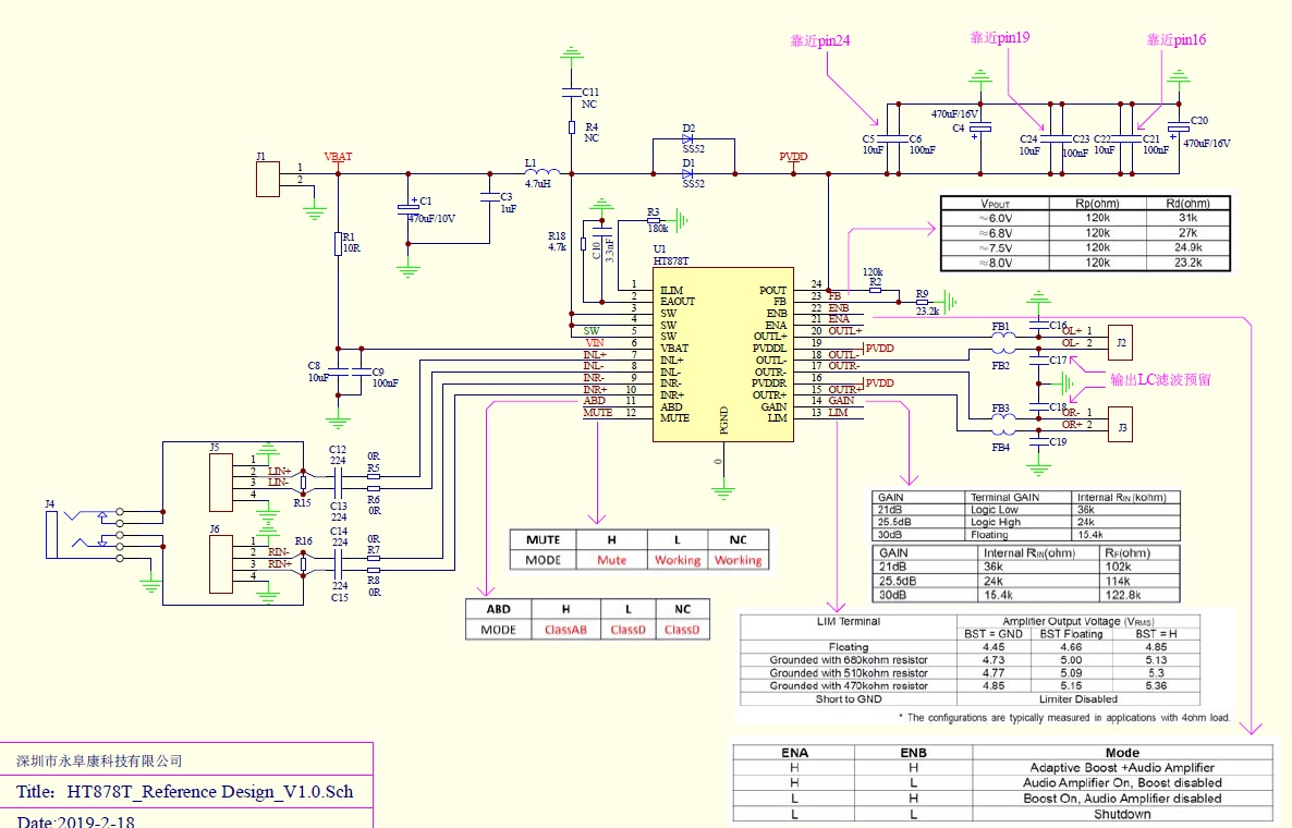 HT878 2X8.5W/2.7V-5.5V(內置自適應升壓模塊)/4Ω TSSOP-24 2.5V-5.5V 可任意限幅、單節鋰電池內置升壓的8W雙聲道音頻功放IC
