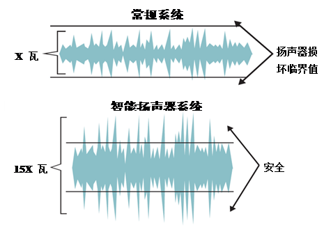 圖 3:揚聲器保護算法使揚聲器能夠輸出比傳統放大器高出兩倍的音量,同時(shí)不會(huì )損壞元器件