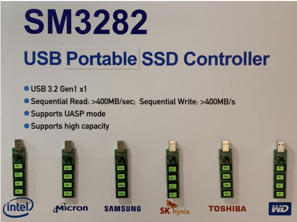目前巿場(chǎng)上可攜式SSD均采用橋接芯片設計,將原SATA或PCIe接口轉接為USB接口。SM3282為單芯片USB 3.2 Gen 1接口設計,提供完整的單芯片硬件及軟件解決方案,并支持UASP協(xié)議。此外,SM3282采用雙通道設計,支持最新一代96層QLC NAND,其容量最高可達2TB;同時(shí),由于采用低功耗設計,毋須外部電源IC即可自行運作,降低物料(BOM)成本。