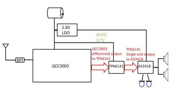 由基于Qualcomm的ANC主動(dòng)式抗噪藍牙耳機所使用的是類(lèi)比式的處理方式,抗噪麥克風(fēng)需經(jīng)過(guò)一連串的RLC組合而成的ANC filter來(lái)達到抗噪功能,若ANC的low pass filter需求極為強烈,則所需的RLC串會(huì )更為復雜,所需的layout空間也會(huì )越大。QCC3003是一顆支持BT5.0 entry level的flash type立體聲藍牙耳機chipset,QFN包裝有利于layout的簡(jiǎn)化,藍牙硬件部分的design凝聚了FAE們的豐富經(jīng)驗,軟件部分通過(guò)QCC3003的I2C來(lái)控制AS3418 ANC的on&off,大大地減輕了客戶(hù)欲應用此方案可能產(chǎn)生的資源消耗。用戶(hù)只需要來(lái)fine tune QCC3003的one MIC cVc,因為每只耳機具有不同的聲學(xué)結構,不同的MIC位置需要做的fine tune來(lái)達成該耳機最優(yōu)化的echo cancel跟noise reduction表現。