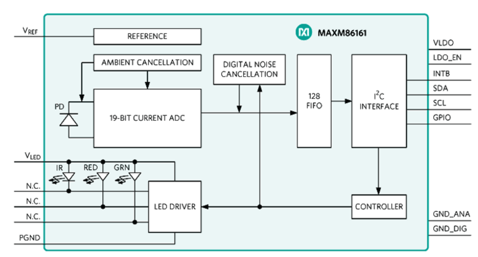 MAX86161入耳式心率監測儀提供同類(lèi)最佳的信噪比(SNR),可用于連續心率和血氧飽和度(SpO2)測量。它集成了三個(gè)可編程的高電流LED驅動(dòng)器,但只需要3.0到5.5 V的單個(gè)電壓源。接收器使用帶光學(xué)讀出通道的高效PIN光電二極管。該通道具有低噪聲信號調理模擬前端(AFE),由19位ADC和環(huán)境光消除(ALC)電路組成,支持柵欄檢測和替換算法。