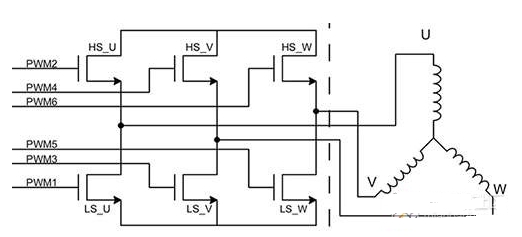 在典型布局中,使用脈寬調制 (PWM) 控制 MOSFET 柵極,可以有效地將輸入 DC 電壓轉換為調制驅動(dòng)電壓。其中應使用至少比預期最大電機轉速高一個(gè)數量級的 PWM 頻率。一對 MOSFET 可以控制一個(gè)電機相位的磁場(chǎng)。
