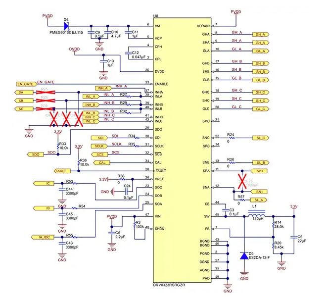 一般來(lái)說(shuō),好的設計思路是盡量減少高壓側和低壓側柵極驅動(dòng)器的回路長(cháng)度,其主要目的是減少 EMI。高壓側回路是從 DRV8323 GH_X 到功率 MOSFET,并通過(guò) SH_X 返回。低壓側回路是從 DRV8323 GL_X 到功率 MOSFET,并通過(guò) GND 返回。
