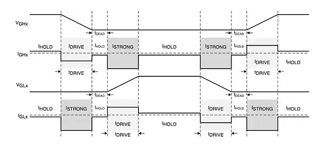 圖 6:在某個(gè)三相 BLDC 電機的 MOSFET 橋中,高壓側 (VGHx) 和低壓側晶體管 (VGLx) 的電壓和電流輸入。IDRIVE 和 tDRIVE 對于電機是否正常運行及效率非常重要;IHOLD 用于將柵極維持在所需狀態(tài);ISTRONG 用于防止低壓側晶體管的柵極至源極電容出現導通。(圖片來(lái)源:Texas Instruments)