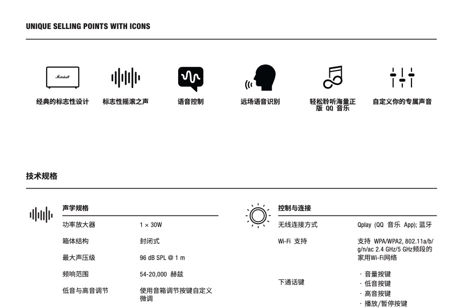 Uxbridge 智能音箱作為 Marshall 標志性家用音箱系列的新成員,融現代智能技術(shù)與標志性的 Marshall 設計元素于一身,在保持經(jīng)典外觀(guān)的同時(shí),帶來(lái)了極富沖擊力的聲音。銀灰色編織面網(wǎng)和標志性手寫(xiě) LOGO 等經(jīng)典元素共同構成了 Uxbridge 智能音箱的堅實(shí)箱體。此外,音箱頂部設計靈感來(lái)源于吉他品格的黃銅按鍵,可以助你輕松調節出你想要的聲音。