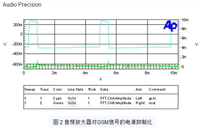 在 TDMA 和 GSM 手機中,最嚴重的電源電壓噪聲來(lái)自 RF 級的開(kāi)與關(guān)。GSM 電話(huà)的開(kāi)關(guān)頻率為 217Hz。當 RF 功率放大器接通時(shí),從電源獲得高電流,這時(shí)電源下降高達 500mV。PSRR 差的音頻放大器將在揚聲器產(chǎn)生大于 217Hz 的諧波“咔咔”噪聲。圖 2為PSRR為60dB的放大器對GSM信號的抑制能力。